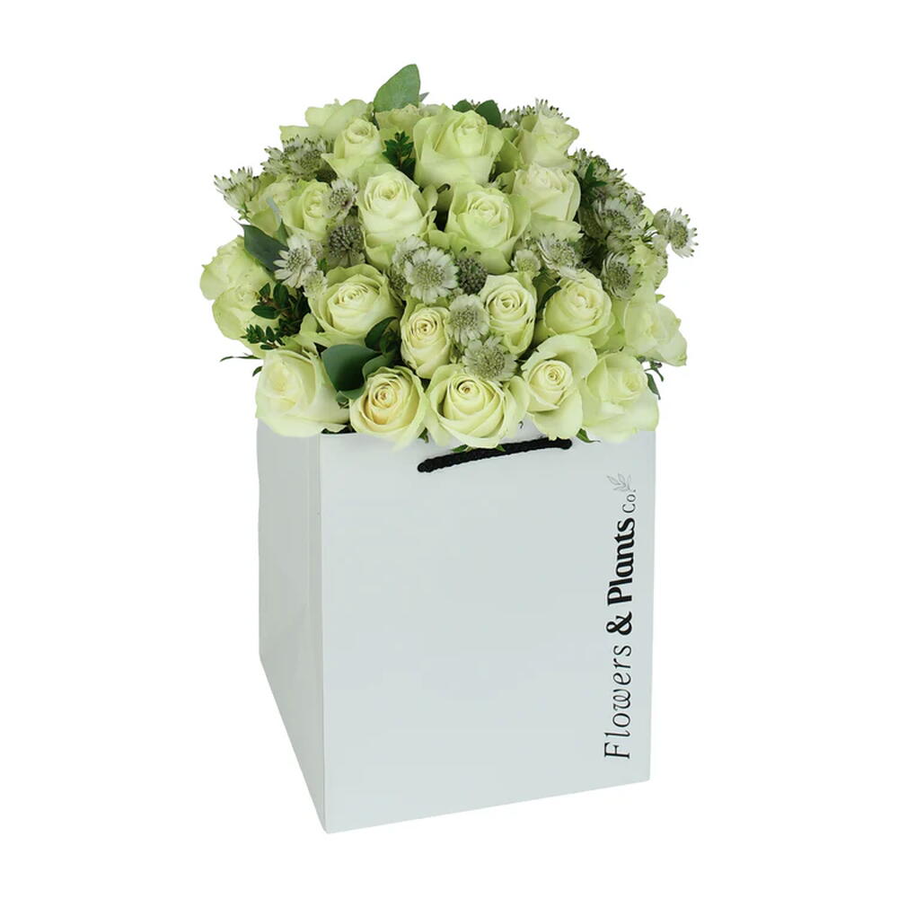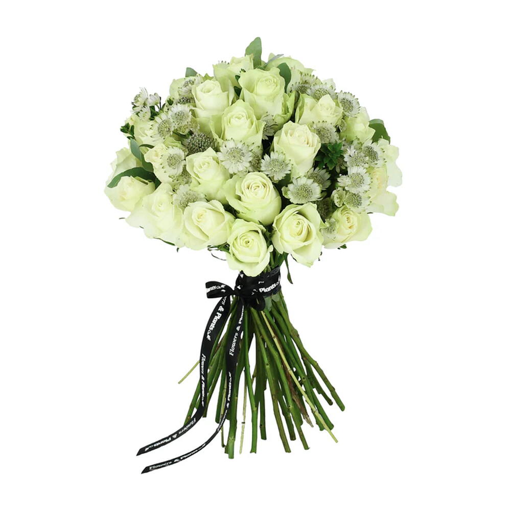 Pure, elegant and effortlessly refined. Crisp white roses and delicate astrantia come together in a beautifully understated arrangement, finished with lush seasonal foliage.
