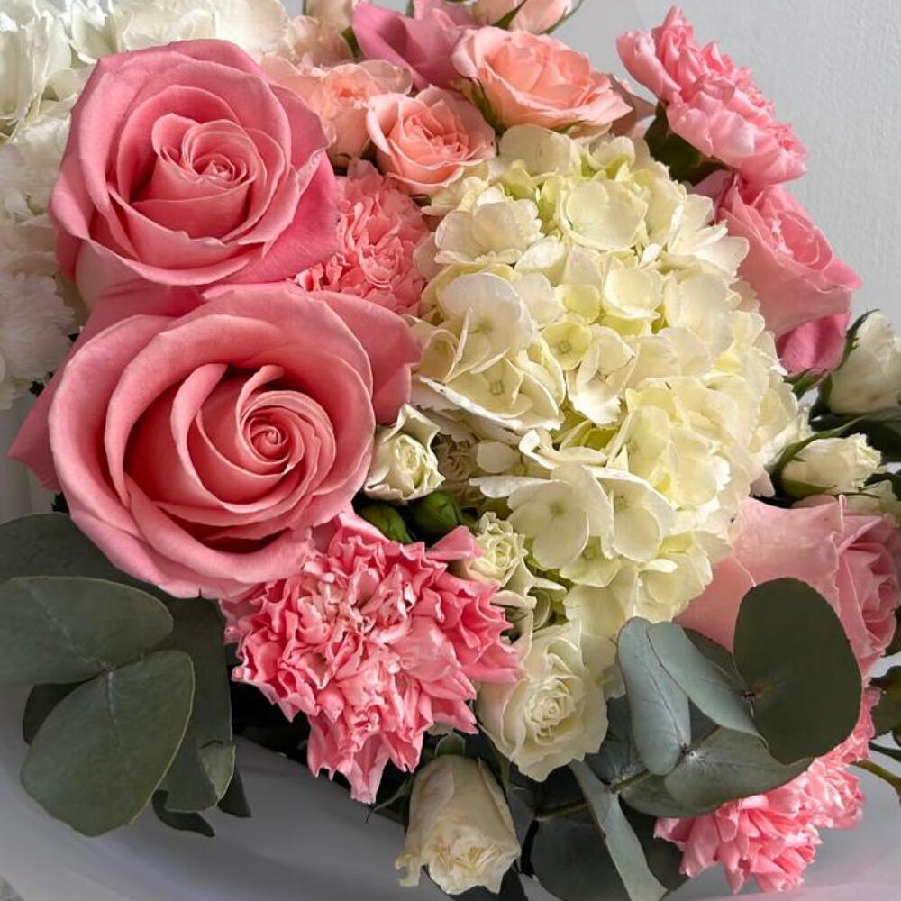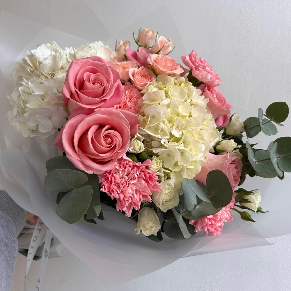 Eucalyptus - 2 pcs Pink rose - 4 pcs pink spray rose - 2 pcs white hydrangea - 2 pcs pink peony rose - 4 pcs