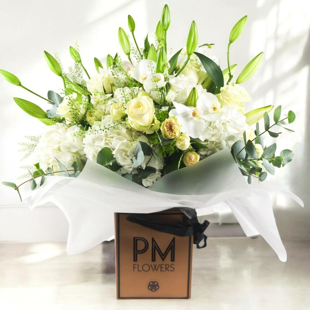 Introducing Odin, a commanding and luxurious white bouquet that radiates strength, elegance, and divine calm. This spectacular arrangement is masterfully composed of 3 white Hydrangeas, 6 white large-headed Roses, 5 white Spray Roses, 4 white Oriental Lilies, 2 Phalaenopsis Orchid stems, 2 white Cymbidium Orchids, 3 white Lisianthus, 2 stems of green Bell, and seasonal Eucalyptus and textured foliage for depth and freshness. Care Instructions: To extend the life of your Odin bouquet, trim the stems diagonally and place them in clean, cool water immediately upon arrival. Change the water every two days, keep the flowers out of direct sunlight and away from heat sources, and remove any leaves submerged in water to prevent bacteria growth.