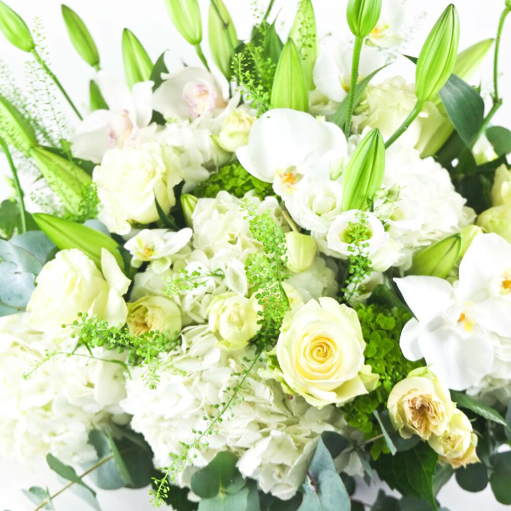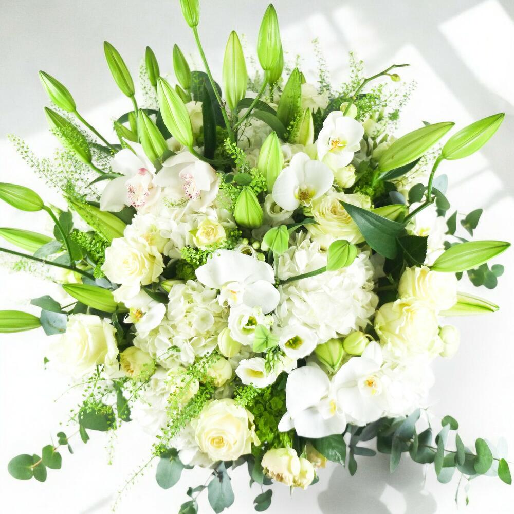 Green bell - 2 pcs white spray rose - 5 pcs white lisianthus - 3 pcs phalaenopsis orchid - 2 pcs white oriental lilies - 4 pcs white hydrangeas - 3 pcs white roses - 6 pcs white cymbidium orchid - 2 pcs