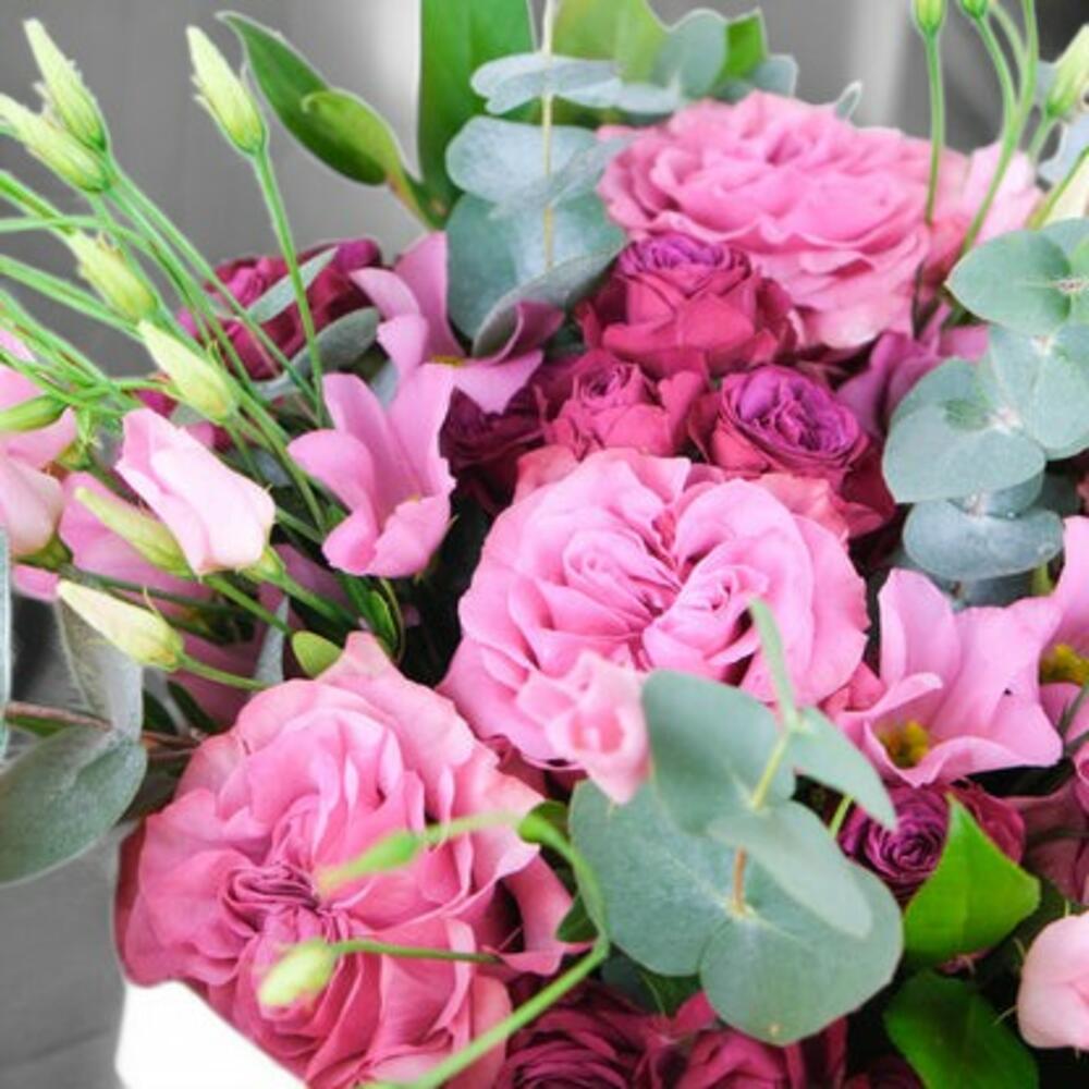 Eucalyptus - 2 pcs pink lisianthus - 3 pcs purple spray roses - 5 pcs large-headed cerise roses - 5 pcs
