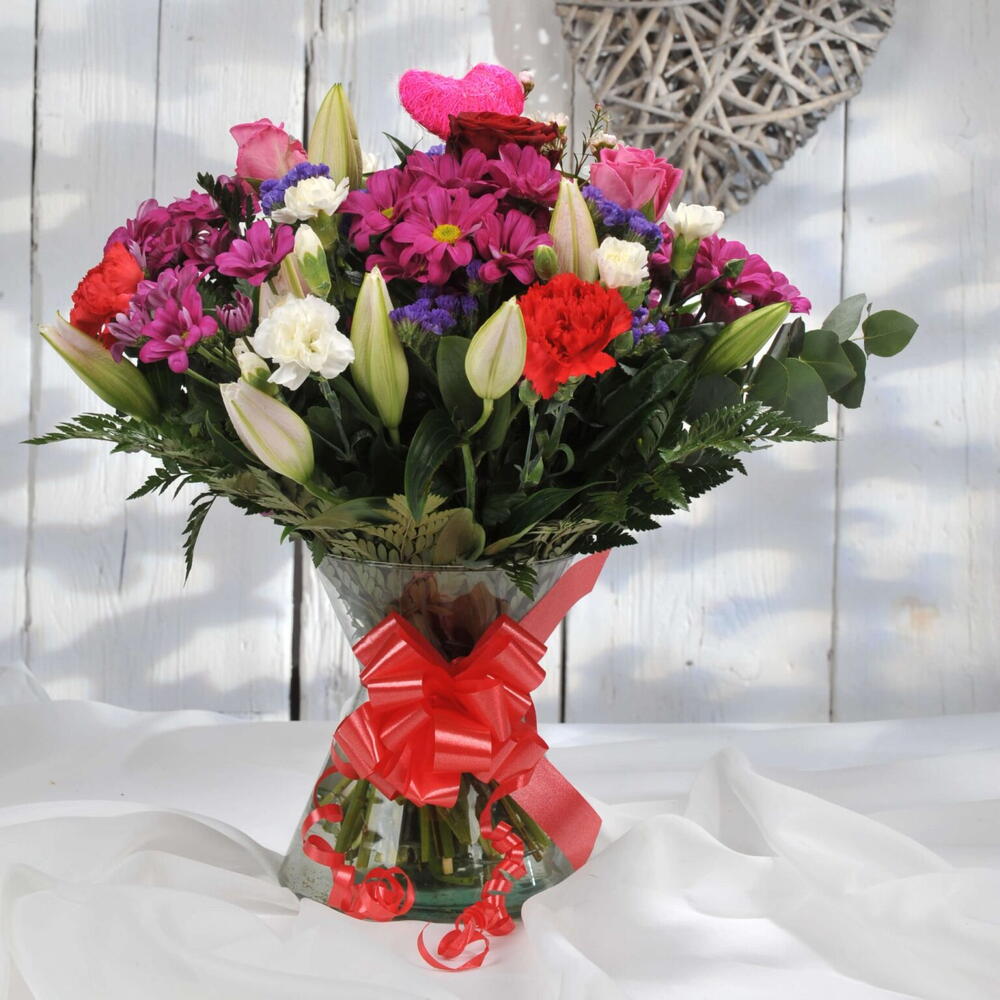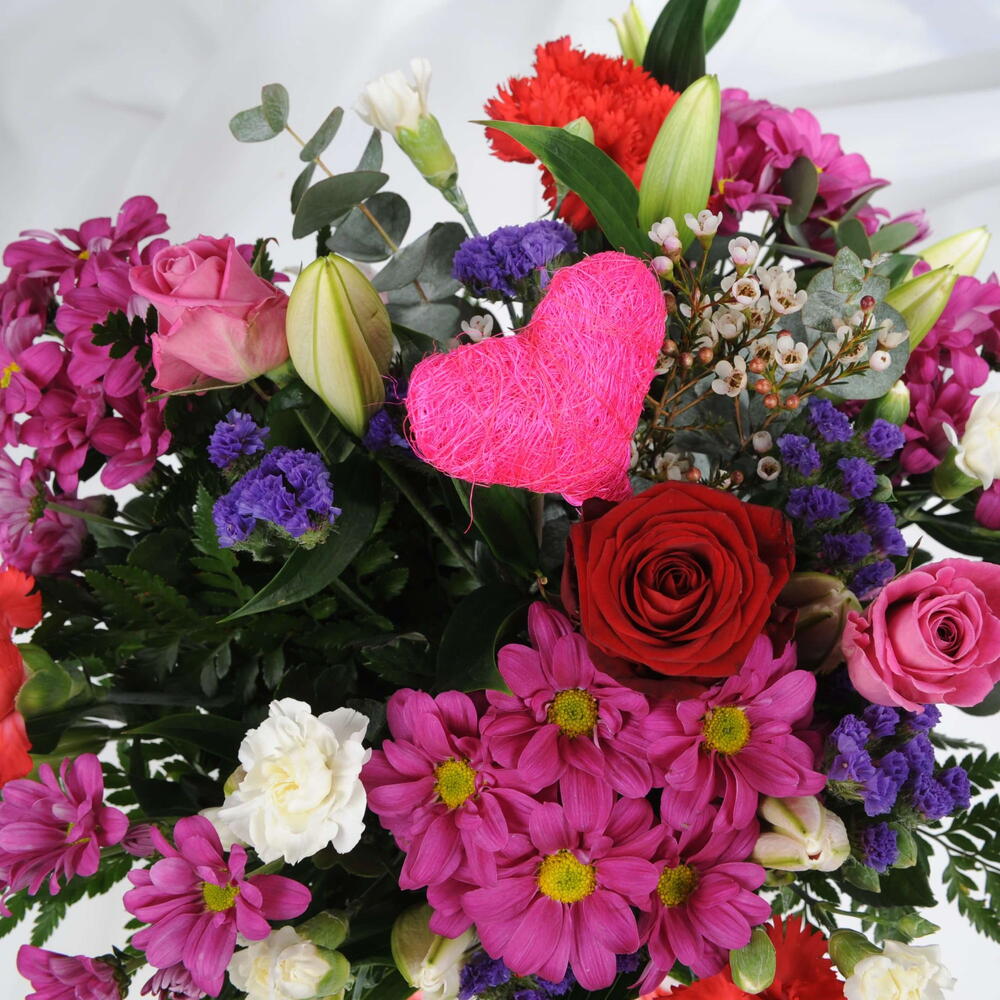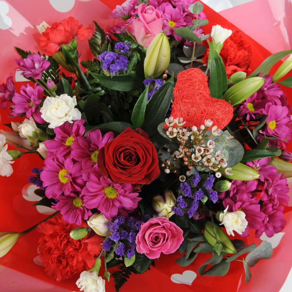 One Love is a vibrant and passionate bouquet designed to express deep affection. The rich mix of red roses, pink carnations, purple asters, and elegant lilies creates a stunning arrangement that symbolizes love, joy, and appreciation. Each flower, from the delicate baby’s breath to the bold chrysanthemums, brings its own charm and elegance. A heart-shaped decorative element adds a personal, romantic touch, making this bouquet perfect for special occasions like Valentine’s Day, anniversaries, or simply to brighten someones day with a burst of love and color. Its bold yet tender appearance captures the essence of love in full bloom. A perfect gesture for someone truly special.