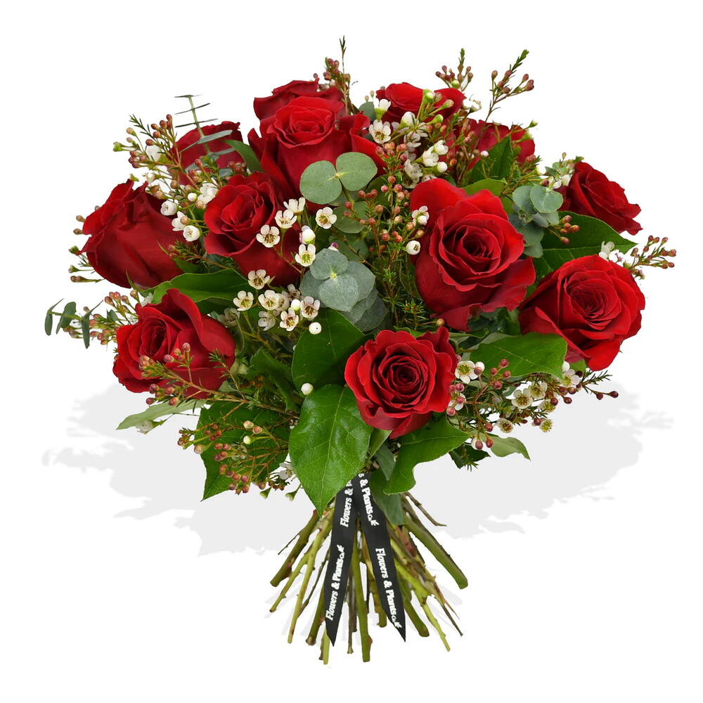 Eucalyptus - 10 pcs red roses - 15 pcs white waxflowers - 5 pcs