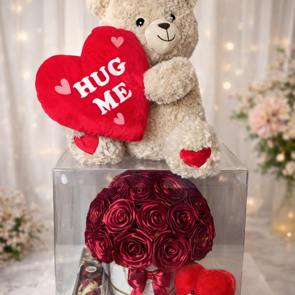 This is a one-of-a-kind, luxury floor-standing gift arrangement designed as a true statement piece. Only one single item has been created and it will never be repeated. Standing approximately 80 cm tall, this exclusive gift is presented in a large transparent display box and topped with a giant teddy bear, creating an unforgettable visual impact. Perfect for those moments when an ordinary gift is simply not enough. 🎁 What’s included Large transparent luxury gift box (floor-standing) 32 handmade satin roses arranged as a bouquet 7 handmade chocolate hearts (artisan chocolates, made by hand) Soft plush heart Large teddy bear (approx. 50 cm) placed on top of the box. ✨ Why this gift is special ✔️ ONE OF ONE – only one piece available worldwide ✔️ Handmade elements luxury presentation ✔️ Impressive 80 cm height ✔️ Designed as a statement / display gift ✔️ Ideal for luxury occasions and grand gestures