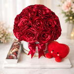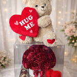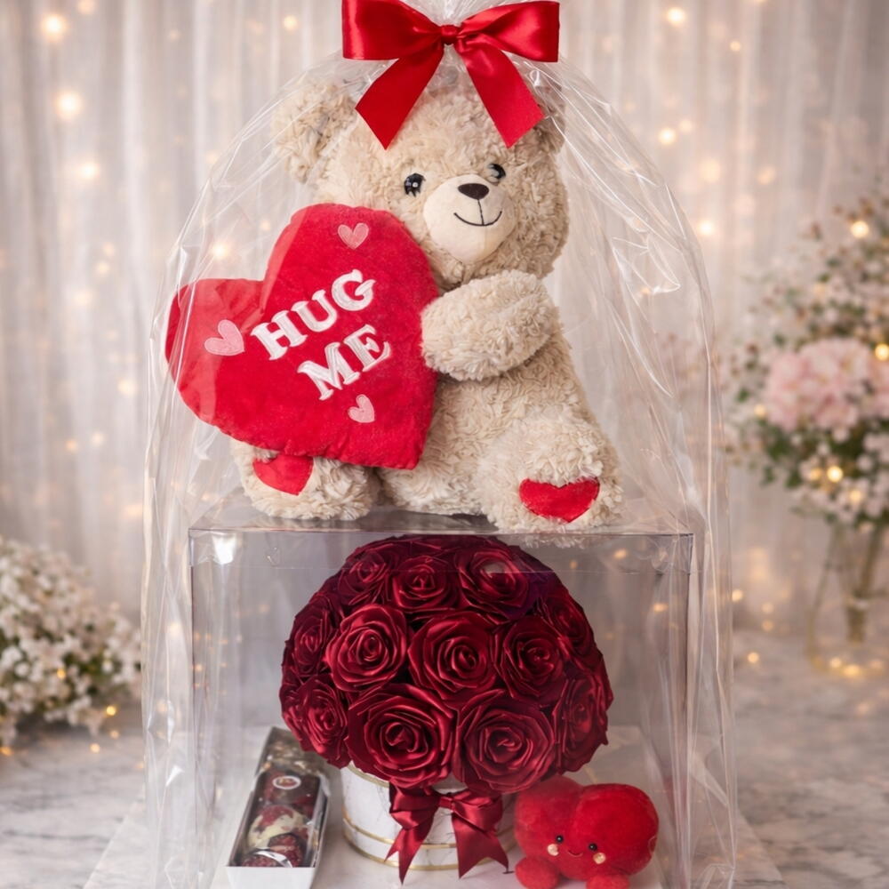luxury rose bouquet (32 satin roses) - 1 pcs handmade chocolate heart - 7 pcs giant teddy bear (50 cm) - 1 pcs plush heart toy - 1 pcs transparent display gift box - 1 pcs