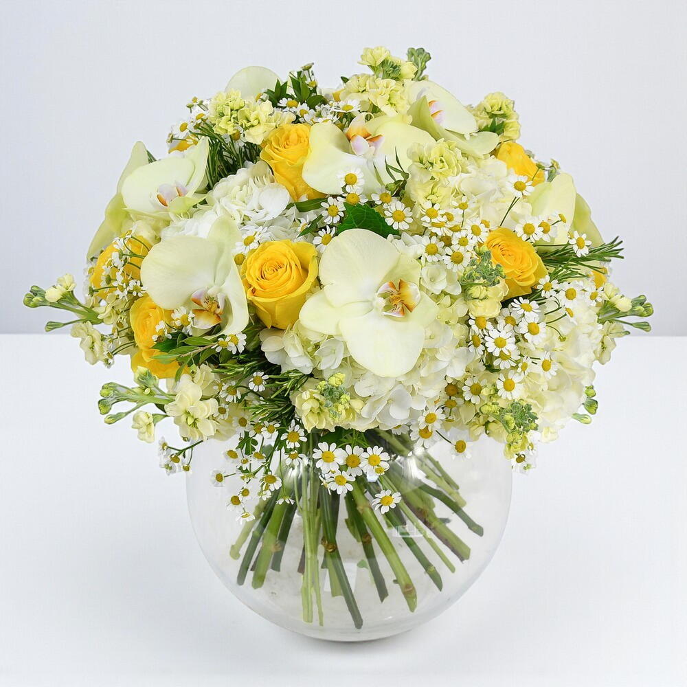 rosemary - 5 pcs white hydrangeas - 5 pcs camomiles - 5 pcs yellow roses - 9 pcs seasonal greenery (bunch) - 1 pcs green phalaenopsis orchids - 9 pcs yellow stocks - 9 pcs