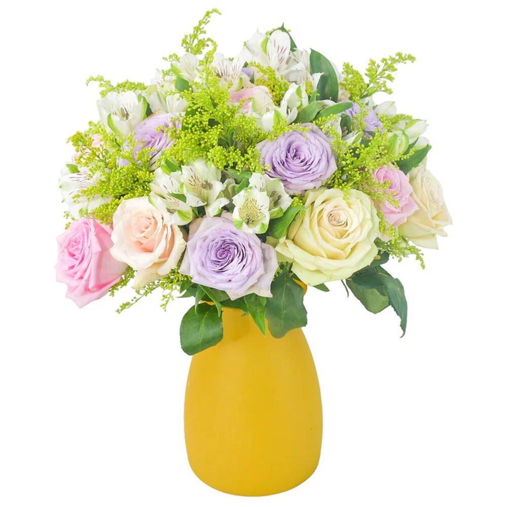 Our finest pastel roses are combined with exotic alstroemeria solidago. Bright, fun and vibrant, this bouquet is the perfect way to celebrate all of life’s best moments.