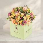 Embrace a timeless aesthetic with The Peach Heirloom, an abundant arrangement that celebrates the classic beauty of full-bodied roses. This decadent bouquet is a tapestry of texture, pairing ruffled peach petals with the deep, saturated hues of fragrant lisianthus. Accented with the dainty charm of spring bulbs and ethereal pink waxflower, it is a graceful and high-impact choice designed to offer a sense of grandeur and a soft, sun-drenched radiance to your home.