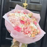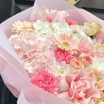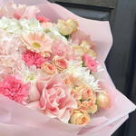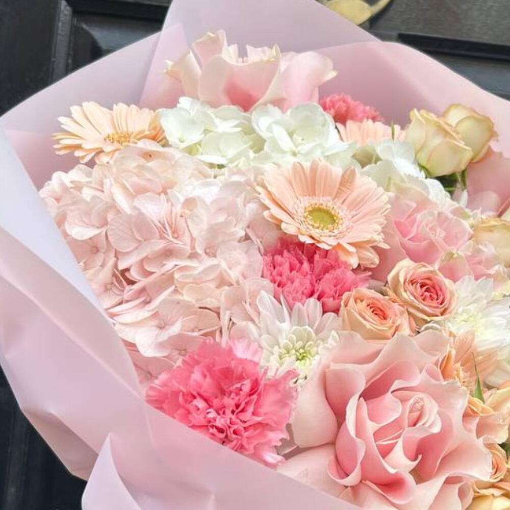 A beautifully soft and feminine bouquet crafted in delicate shades of blush, peach and pastel pink. Lush hydrangeas, elegant roses and playful gerberas come together with carnations and seasonal blooms to create a bouquet full of texture, movement and gentle romance.