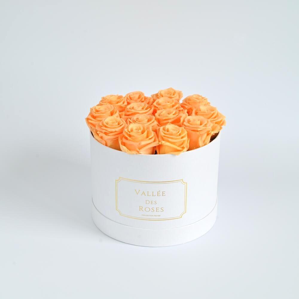 Vibrant and full of warmth, these preserved orange roses radiate joy and energy. Nestled in a pristine white hatbox with elegant gold detailing, this arrangement adds a lively and luxurious touch to any space or celebration. The roses are 100% real and have undergone a special preservation process to maintain their beauty for over a year. No watering or maintenance is required—just keep them away from direct sunlight and high humidity to enjoy their long-lasting charm.