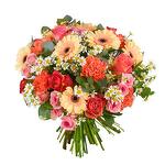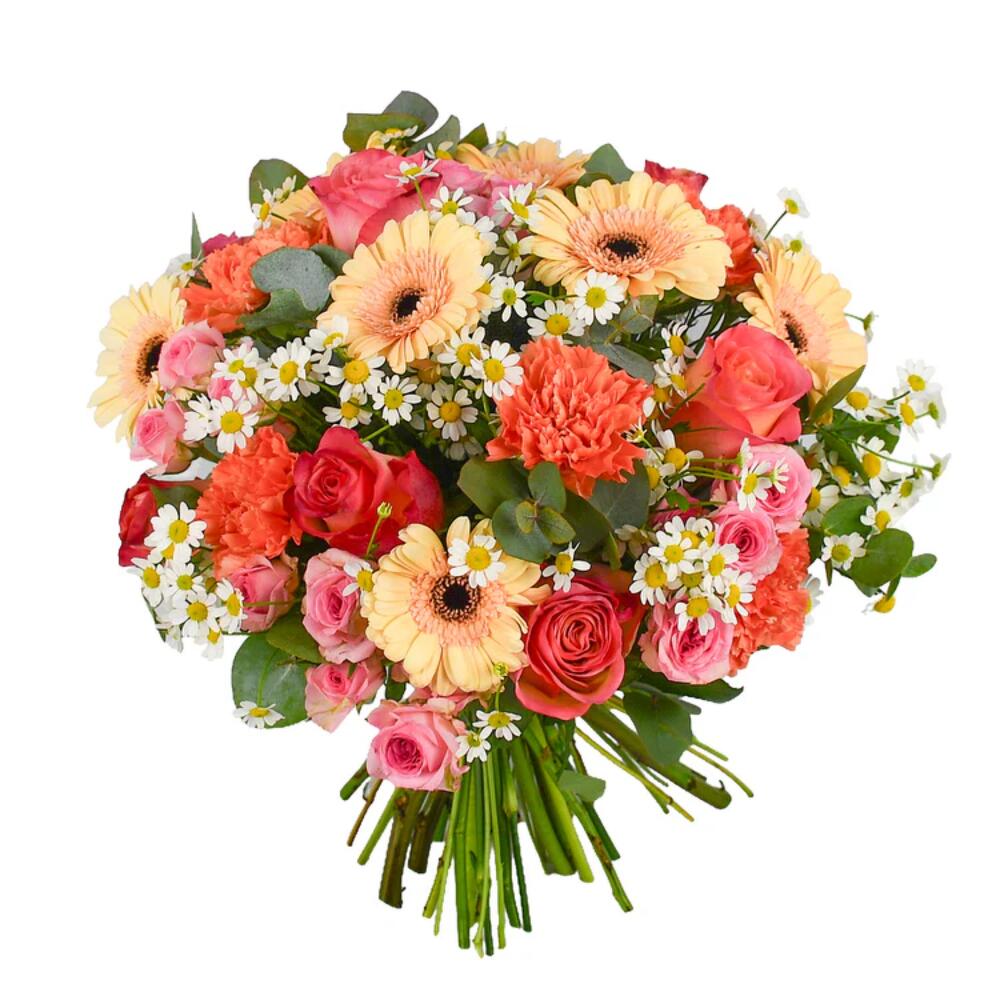 pink spray rose - 4 pcs tanacetum - 4 pcs orange carnations - 6 pcs peach gerbera - 6 pcs pink roses - 4 pcs seasonal greenery (bunch) - 1 pcs
