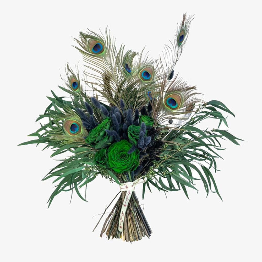 bunch of eucalyptus - 1 pcs preserved roses - 5 pcs peacock feathers - 8 pcs bunch of black bunny tales - 1 pcs bunch of blue bunny tales - 1 pcs