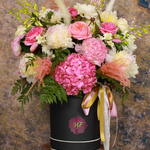 elegant white dendrobium orchids - 10 pcs stunning pink hydrangeas - 3 pcs vivid pink augustine roses - 10 pcs seasonal assorted greens - 20 pcs pristine white chrysanthemum - 10 pcs blushing pink chrysanthemum - 10 pcs