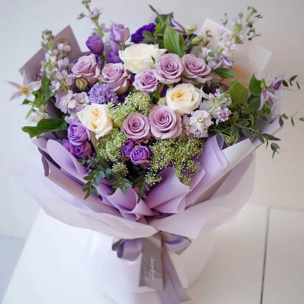Clematis - 9 pcs White rose - 9 pcs lavender rose - 9 pcs purple lisianthus - 9 pcs white astrantia - 9 pcs bunch of eucalyptus - 1 pcs purple stock - 9 pcs
