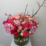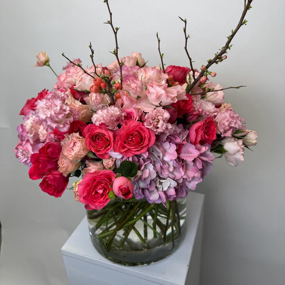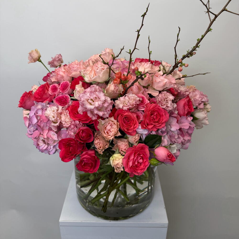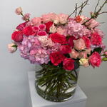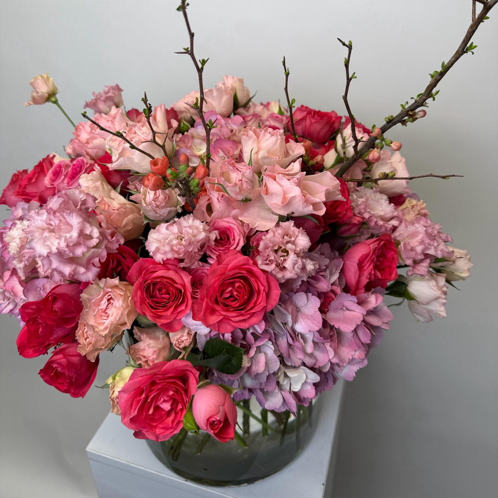 lisianthus pink - 10 pcs hydrangeas pink - 5 pcs spray roses pink color - 10 pcs spray roses rasberry - 10 pcs