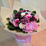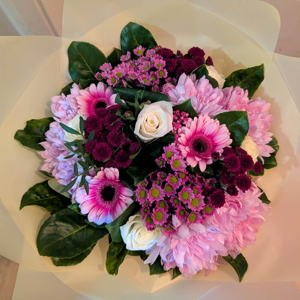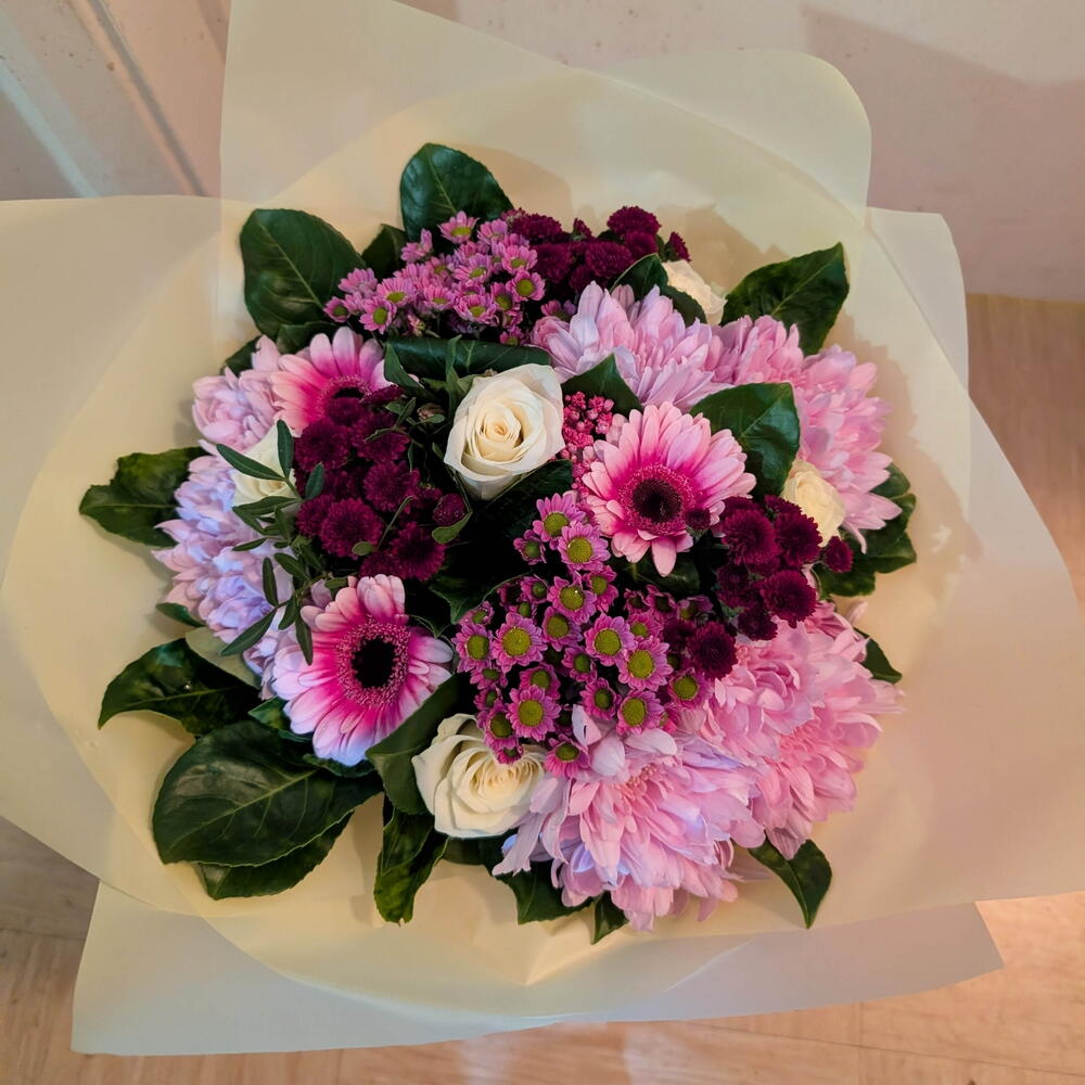Purple gerbera bouquet includes large headed white roses, pink gerberas, a variety of fluffy purple spray chrysanthemums and lush mixed foliage. Aqua packed, bouquet delivered in water Next day delivery available Please note that due to the seasonal availability of flowers it may be necessary to vary individual stems from those shown. We may substitute flowers for one similar in style, quality and value.