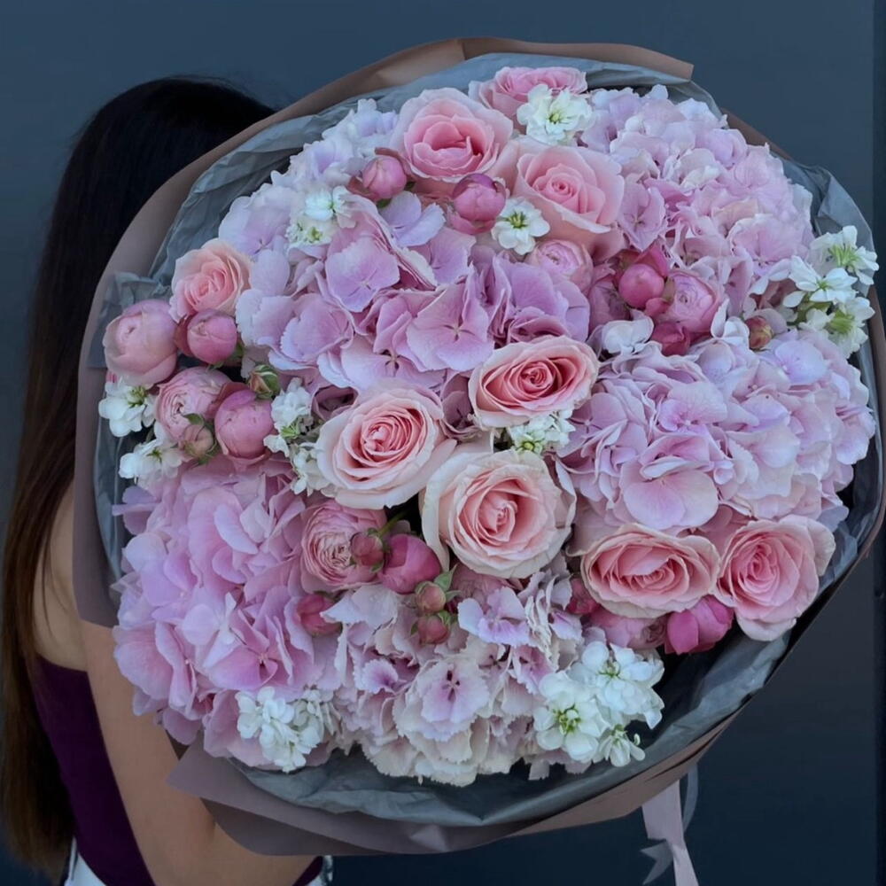 Eustoma - 10 pcs Spray rose - 10 pcs pink hydrangea - 5 pcs roses pink - 10 pcs