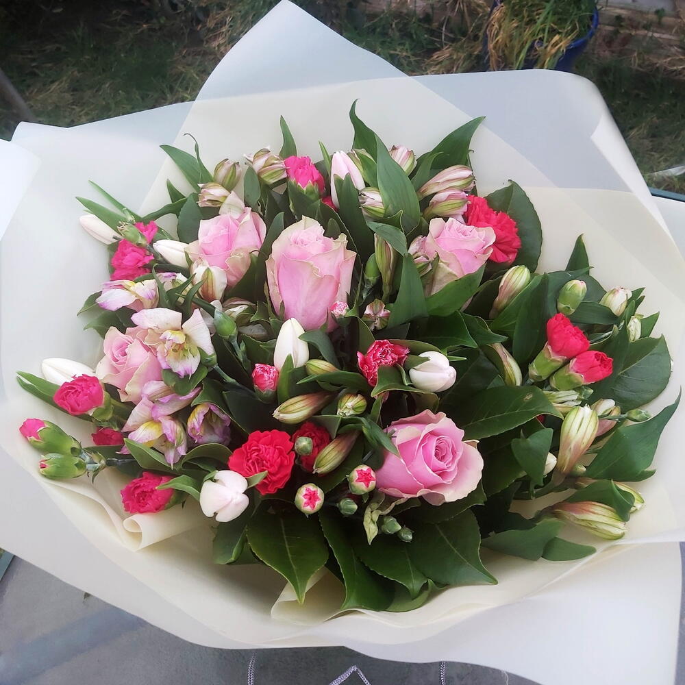 Alstroemeria - 5 pcs carnations - 5 pcs pink roses - 6 pcs