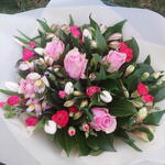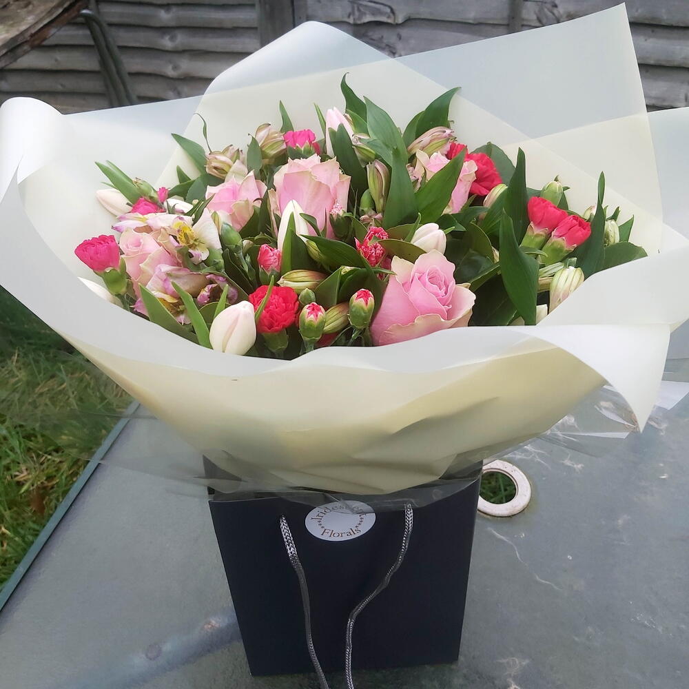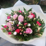 Beautiful pink roses and carnations bouquet, includes long stemmed pink roses, pink carnations, alstroemeria and lush mixed foliage. Aqua packed, bouquet delivered in water Next day delivery available Please note that due to the seasonal availability of flowers it may be necessary to vary individual stems from those shown. We may substitute flowers for one similar in style, quality and value.