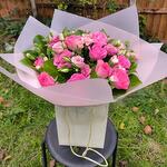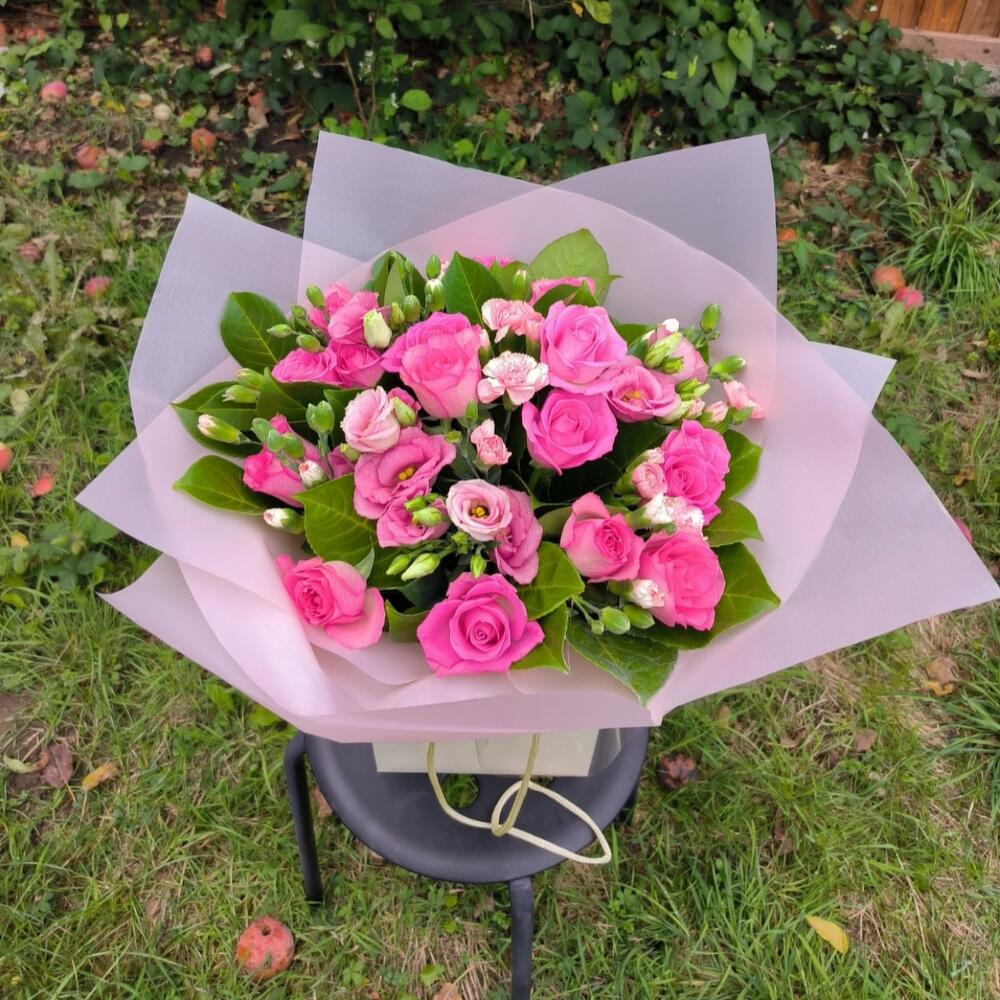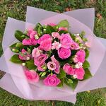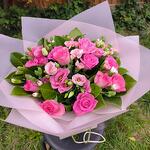 Pink roses lisianthus bouquet, includes long-stemmed pink roses, pink lisianthus, pink spray carnations and lush mixed foliage. Aqua packed, bouquet delivered in water Bouquet shown in picture is Large size, your bouquet will be the same style but smaller Next day delivery available Please note that due to the seasonal availability of flowers it may be necessary to vary individual stems from those shown. We may substitute flowers for one similar in style, quality and value.