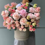 hat box - 1 pcs Eucalyptus systems - 5 pcs pink spray roses stems - 12 pcs blush roses - 9 pcs carnations (blush pink) - 5 pcs