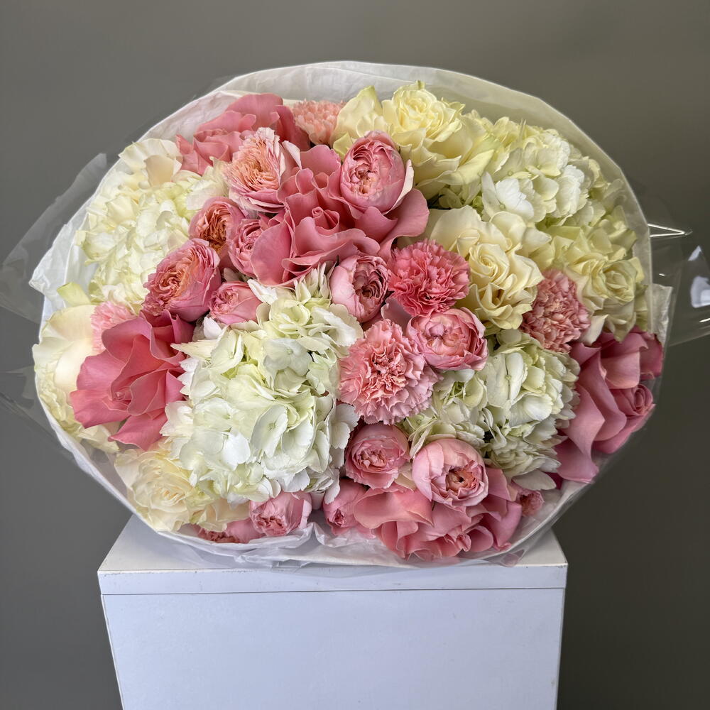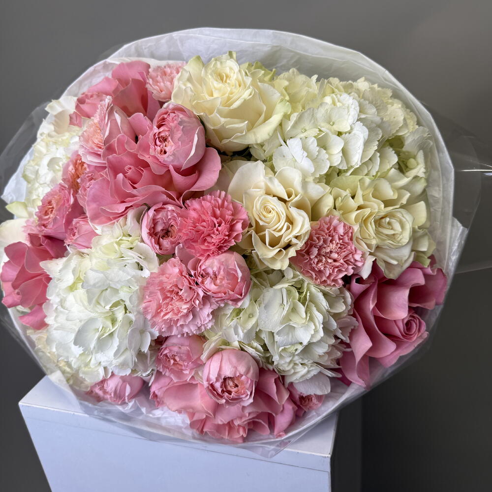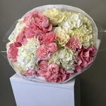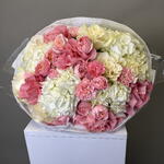 carnation - 5 pcs white hydrangea - 4 pcs spray roses - 4 pcs french roses - 10 pcs