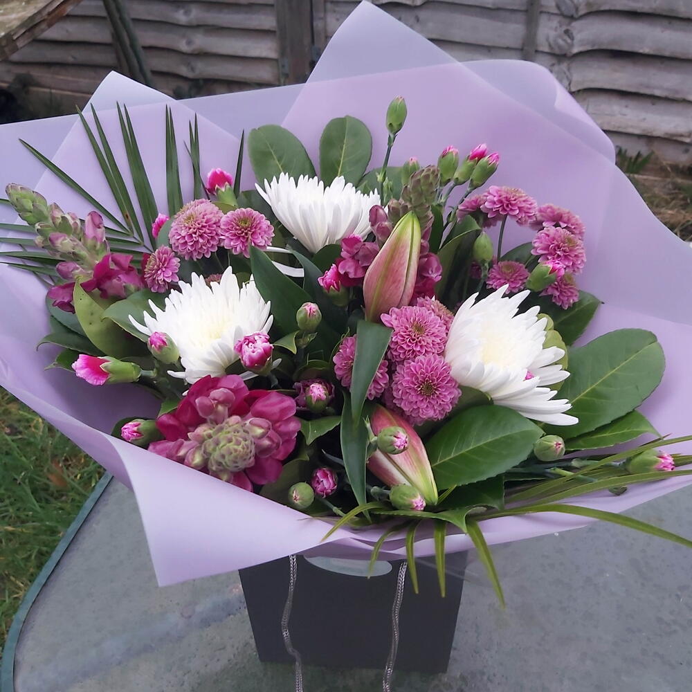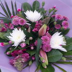 Purple White bouquet, filled with big headed white chrysanthemums, purple button chrysanthemums, carnations, anthirhinums and a mixture of lush green foliage. Aqua packed, bouquet delivered in water Next day delivery available Please note that due to the seasonal availability of flowers it may be necessary to vary individual stems from those shown. We may substitute flowers for one similar in style, quality and value.