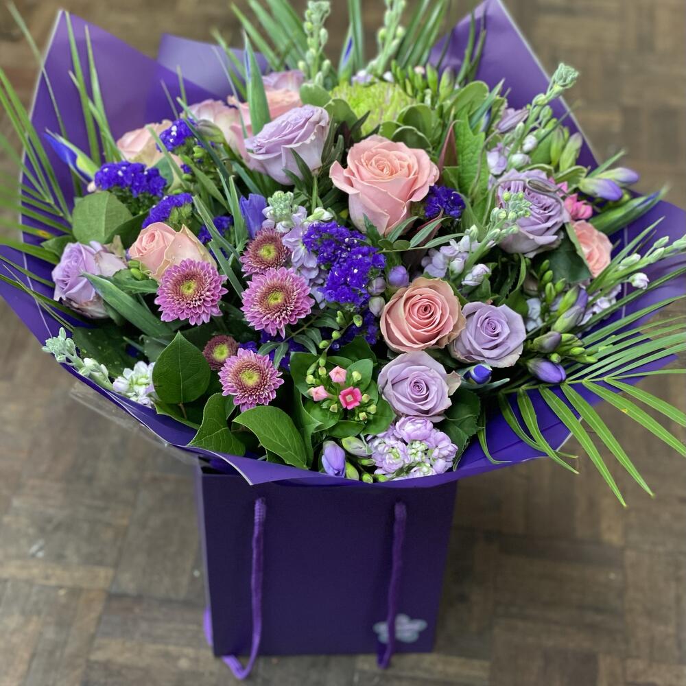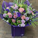 A sophisticated arrangement of roses encased with simply sumptuous pink and purple create this handtied bouquet.