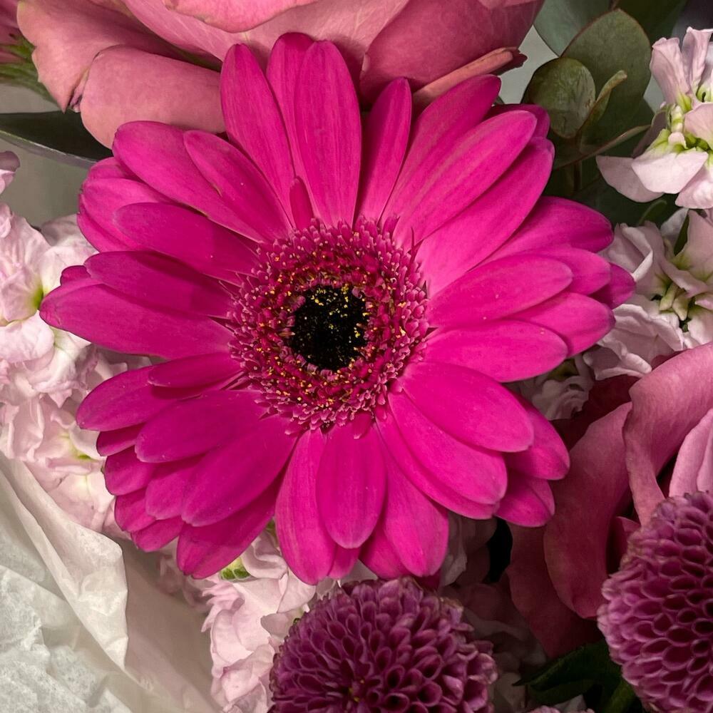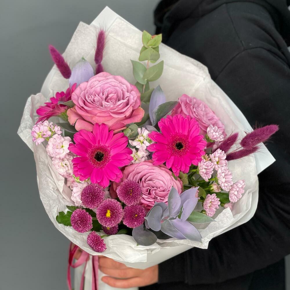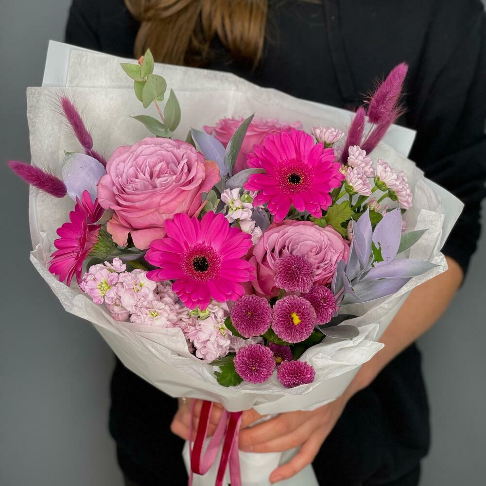 Florist's special bouquet with gerberas, roses, matthiola, and chrysanthemum. It makes a perfect gift on its own or complements another gift for any celebration, whether it's a birthday, anniversary, or just a way to show affection.