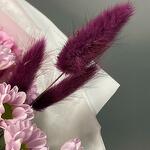 Satin ribbon - 1 pcs Eucalyptus - 1 pcs Ruscus - 3 pcs rose - 3 pcs gerbera mini - 3 pcs matthiola - 3 pcs designer wrapping - 1 pcs santini chrysanthemum - 2 pcs