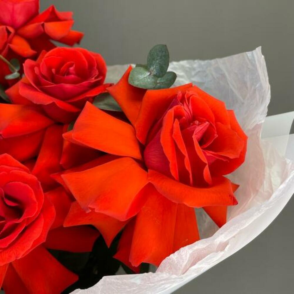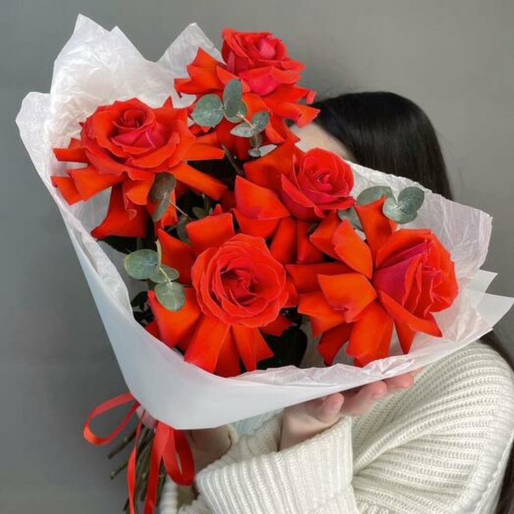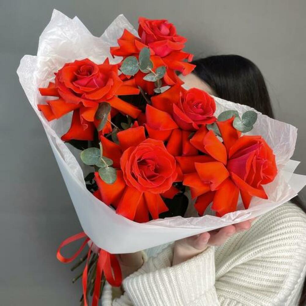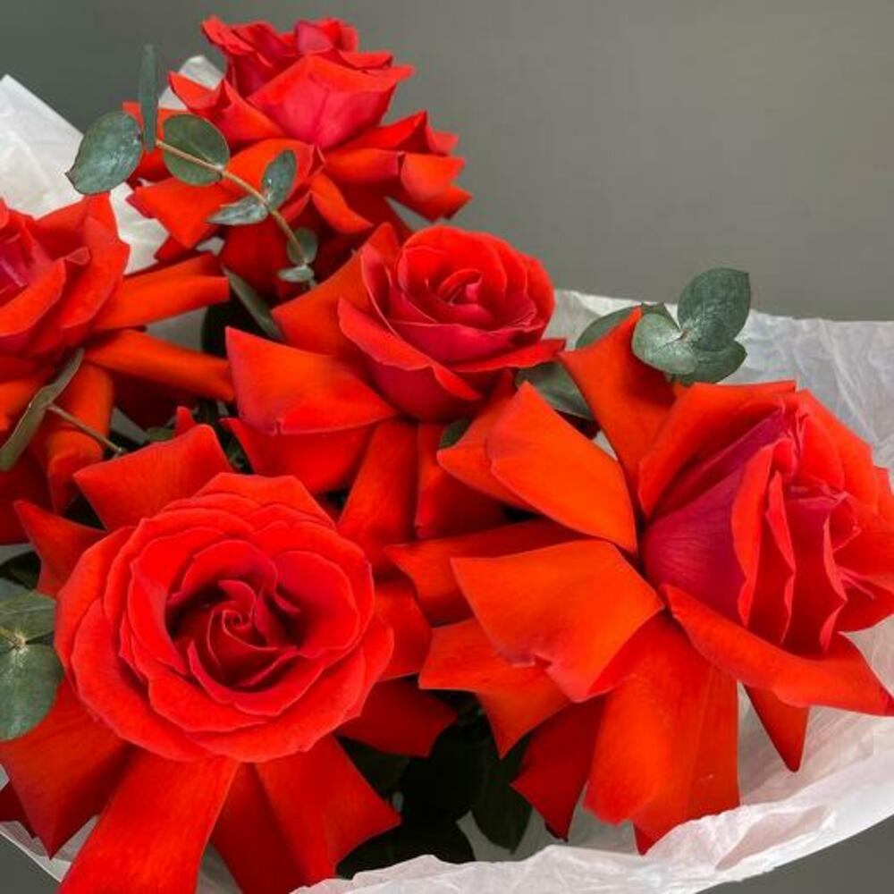 Embrace timeless sophistication with our bouquet, featuring five stunning red French roses complemented by fresh eucalyptus. The rich, velvety red roses symbolize deep affection and elegance, while the aromatic eucalyptus adds a touch of greenery and grace. Hand-tied and beautifully wrapped in crisp white packaging, this bouquet is perfect for expressing heartfelt sentiments or celebrating special moments.