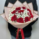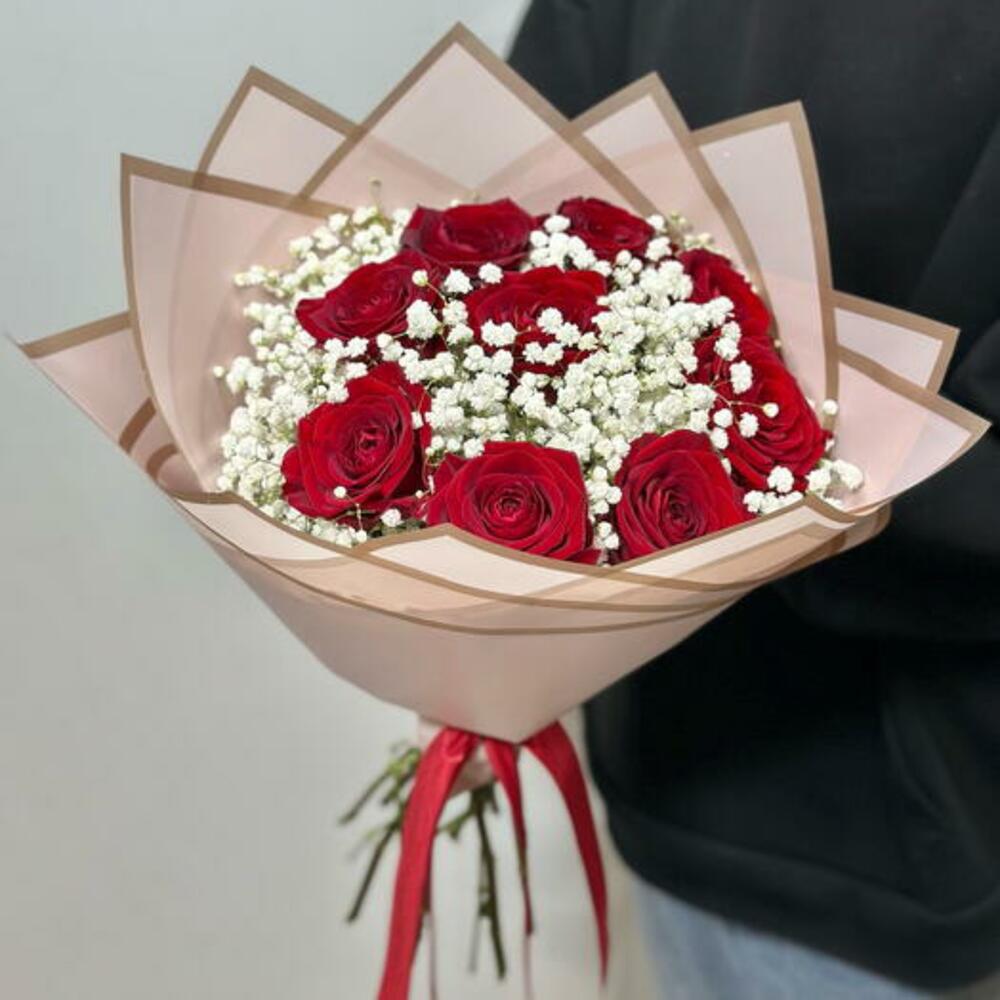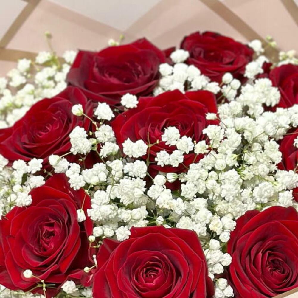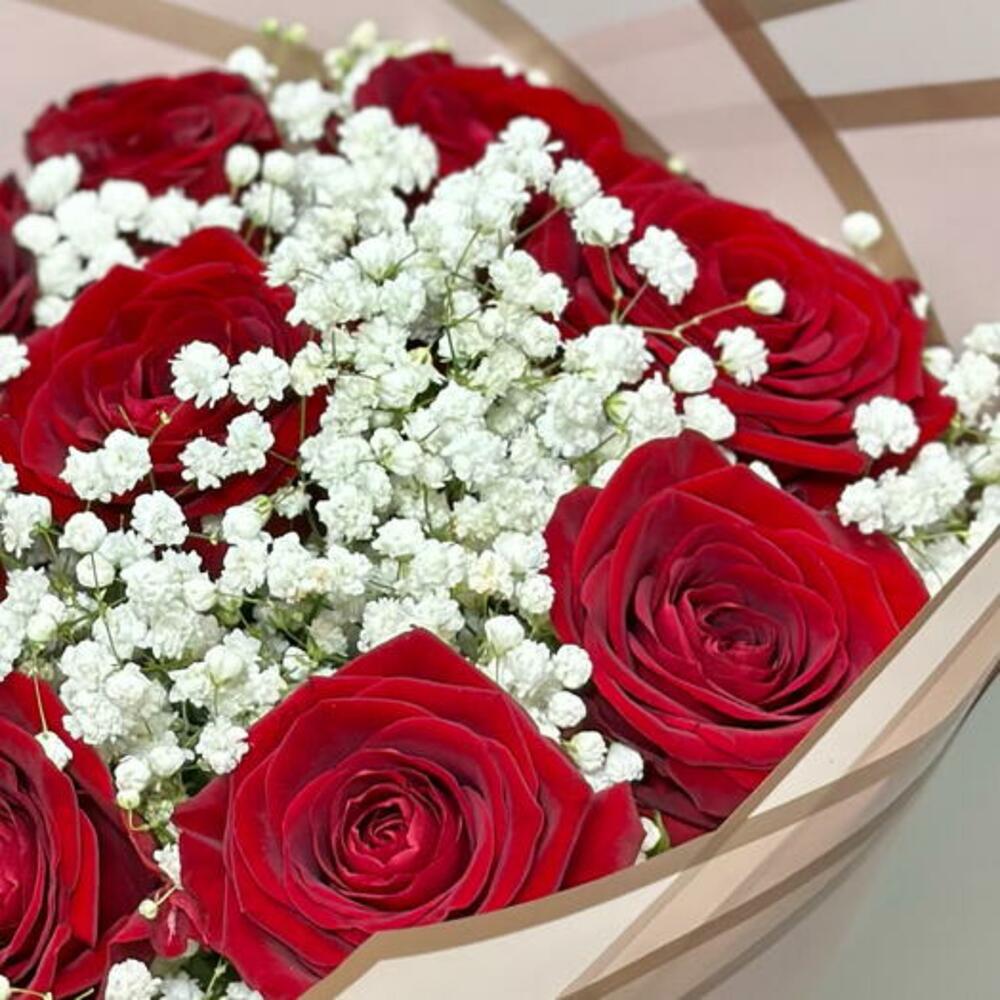 Discover the tenderness of this composition, where red roses are beautifully combined with white gypsophila. This bouquet is your opportunity to give warmth and elegance to those you appreciate.