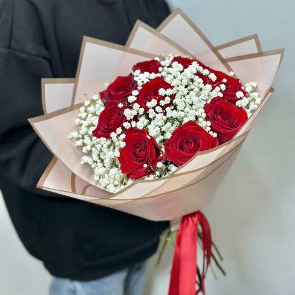 Red rose - 9 pcs packaging - 1 pcs white gypsophila - 2 pcs