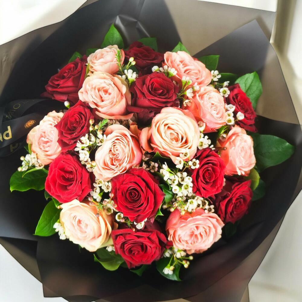 Introducing the Red Velvet bouquet – a luxurious arrangement that blends timeless romance with modern charm. This elegant bouquet features 18 premium large-headed roses, with 9 deep red roses symbolizing passion and 9 soft peach roses representing gratitude and elegance. Delicately finished with dainty white waxflower for texture and contrast, this bouquet is the perfect choice for romantic gestures, anniversaries, or sophisticated celebrations. Handcrafted with care, each bloom is selected for its quality and longevity, presented in premium black wrap and a signature PM Flowers box – a stunning floral gift that leaves a lasting impression. Care Instructions: Keep the bouquet in a cool room away from direct sunlight and heat sources. Recut the stems diagonally and place in clean water if transferred to a vase. Change the water every 2 days and remove wilted blooms to maintain freshness. With proper care, these roses will stay beautiful for 5–7 days.
