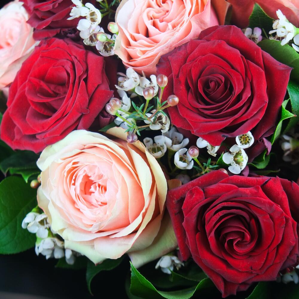 Red Velvet – Luxury Red and Peach Rose Bouquet with Waxflower Accents