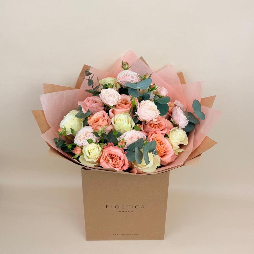 Graceful, romantic, and effortlessly elegant, the Regina Bouquet is a stunning floral arrangement perfect for celebrating lifes special moments. Featuring premium Ecuadorian white and peach roses, beautifully complemented by luxurious spray roses and fresh eucalyptus, it’s designed to impress. Whether youre looking for the perfect birthday flowers, an elegant anniversary gift, or a thoughtful Congratulations bouquet, the Regina Bouquet is a truly special way to brighten someones day.