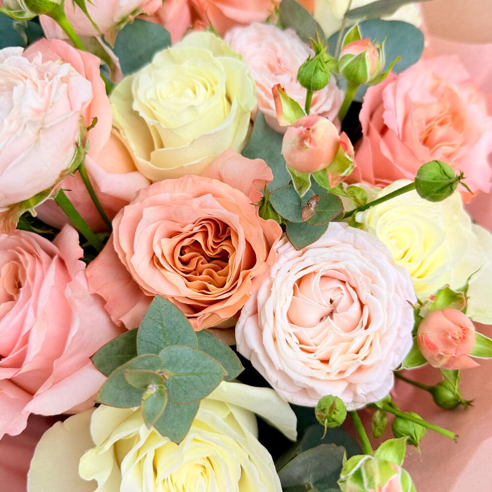 Eucalyptus - 5 pcs White rose - 10 pcs peach rose - 10 pcs blush pink spray rose - 4 pcs