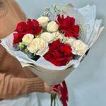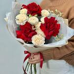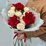 Experience the timeless romance of our elegant bouquet, featuring a captivating blend of deep red roses and delicate cream carnations. This classic combination symbolizes deep love and admiration, making it the perfect gift for anniversaries, Valentines Day, or simply to express your heartfelt emotions. The lush, velvety petals of the red roses contrast beautifully with the soft, ruffled carnations, creating a stunning visual harmony. Wrapped in premium tissue paper and finished with a satin ribbon, this bouquet is a true statement of love and elegance. Show your loved one how much they mean to you with this unforgettable floral arrangement.