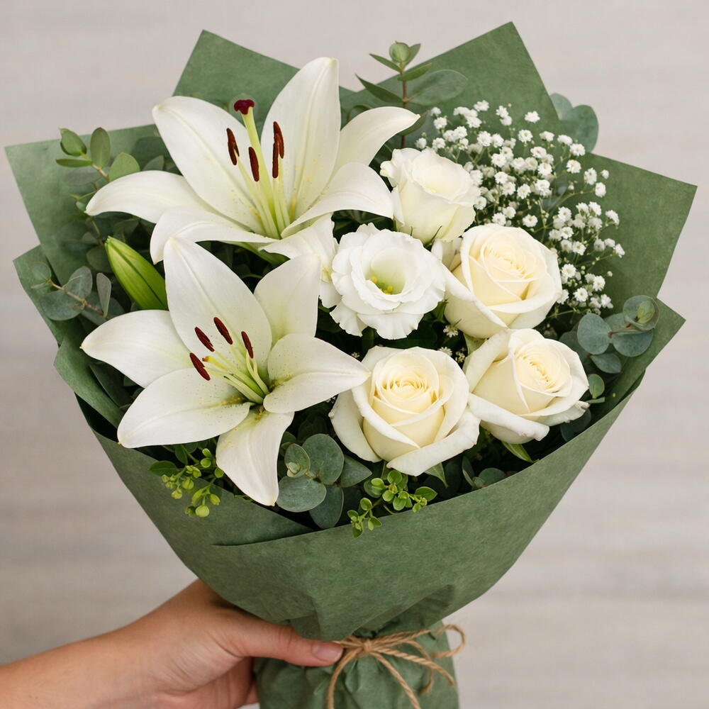 Eucalyptus - 2 pcs Lisianthus - 2 pcs Lilies - 2 pcs Pistachio - 2 pcs roses - 4 pcs
