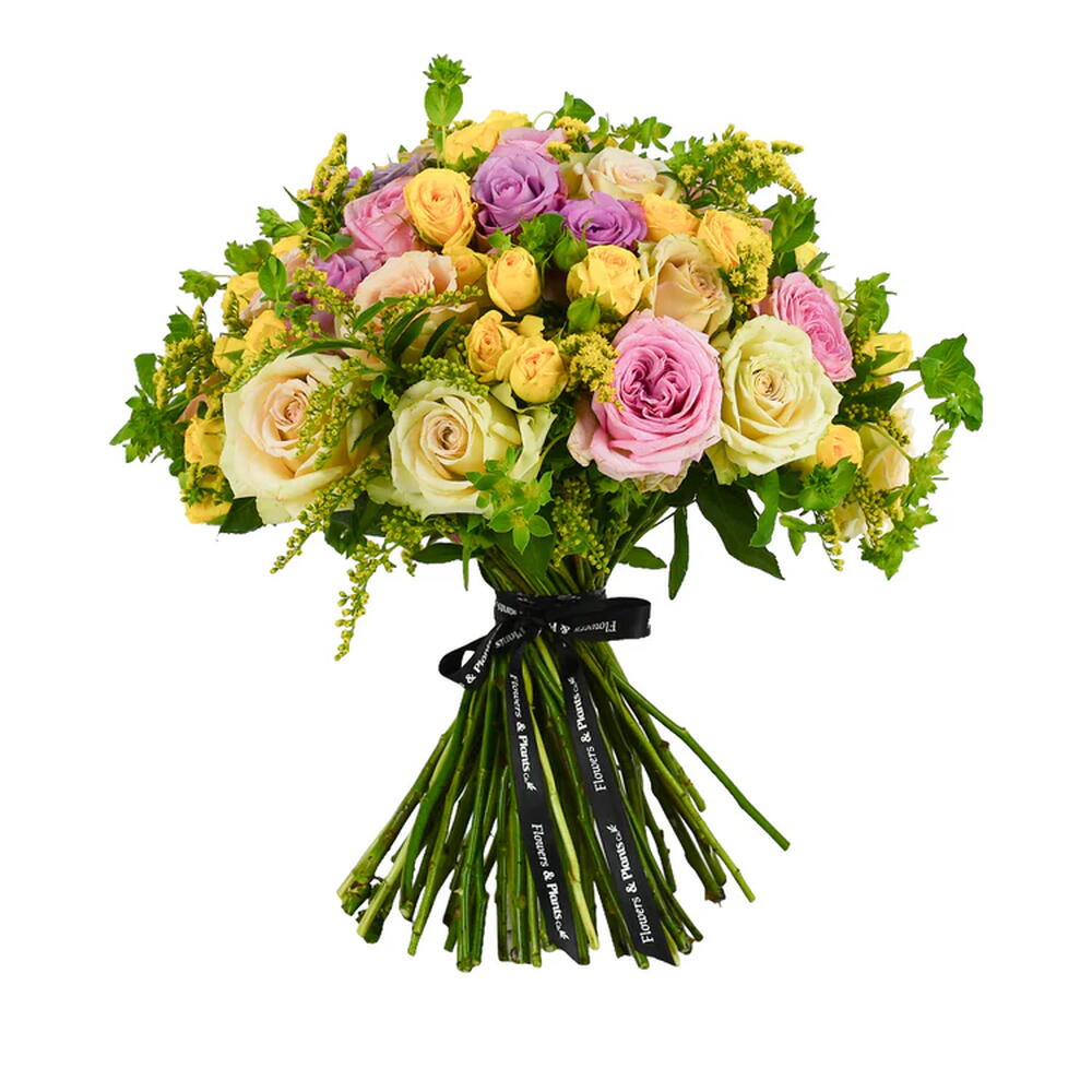 Solidago - 5 pcs bupleurum - 5 pcs yellow spray roses - 5 pcs mixed pastel roses - 30 pcs seasonal foliage (bunch) - 1 pcs