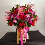 Red rose - 15 pcs red alstroemeria - 10 pcs light pink rose - 10 pcs pink alstroemeria - 10 pcs hot pink rose - 10 pcs pink cymbidium orchids - 9 pcs bunches of seasonal foliage - 2 pcs dry flowers for decoration - 1 pcs