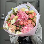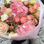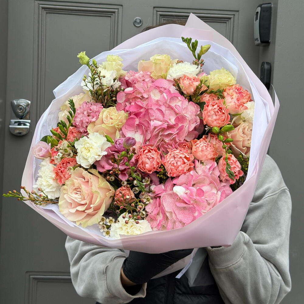 A luxurious bouquet designed in soft blush and warm pink tones, evoking the charm of an early spring garden. Voluminous hydrangeas, ruffled carnations, premium roses and delicate wax flowers create a beautifully textured composition full of romance and depth.