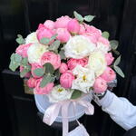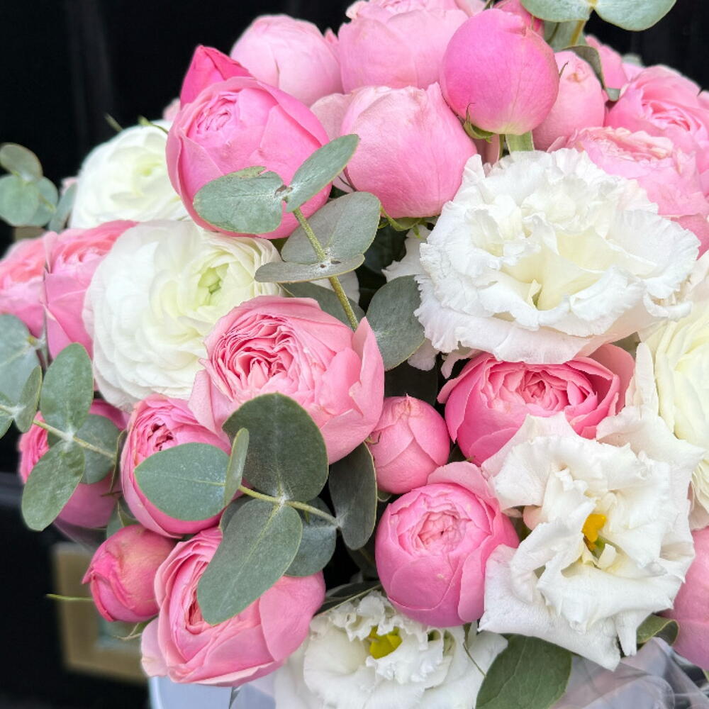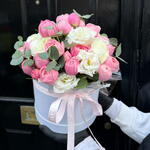 Eucalyptus - 2 pcs Eustoma white - 3 pcs hat box - 1 pcs peony spray rose - 5 pcs