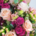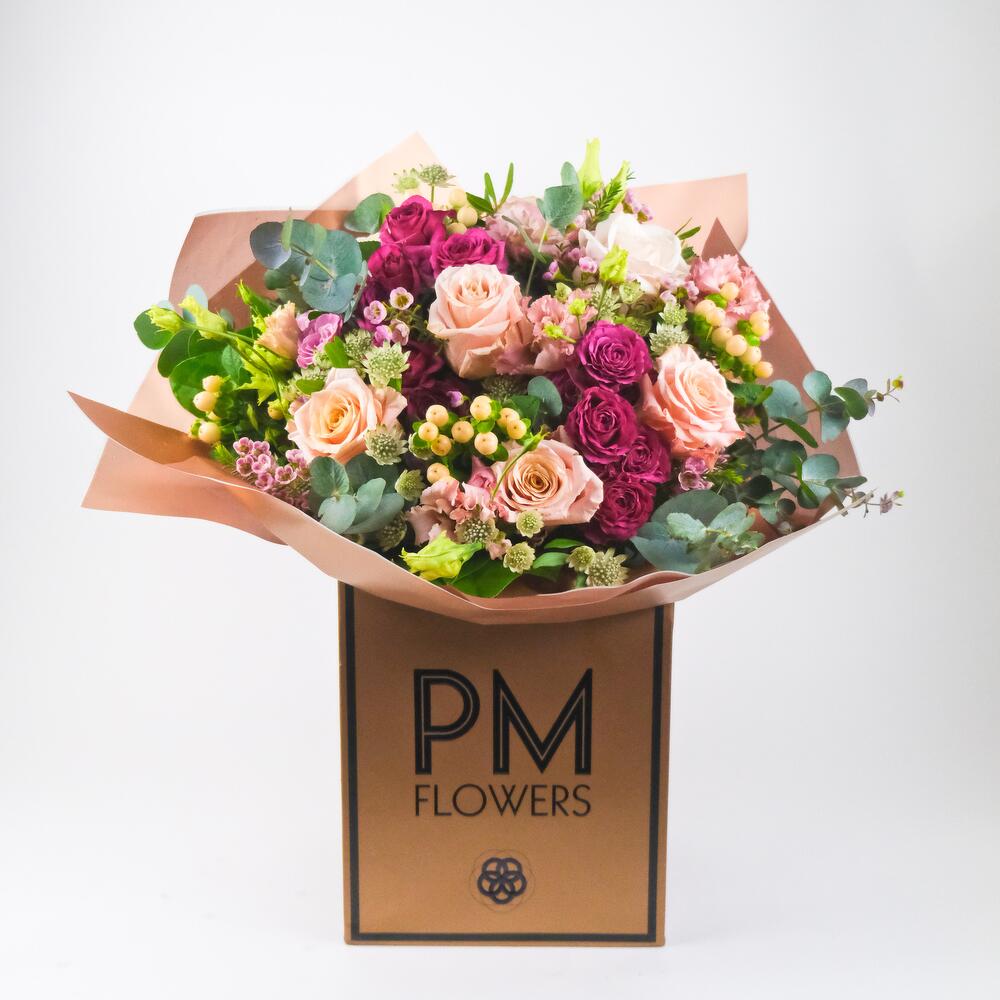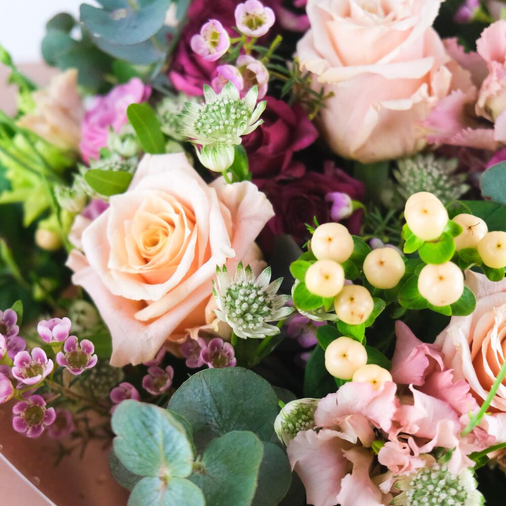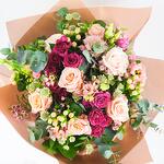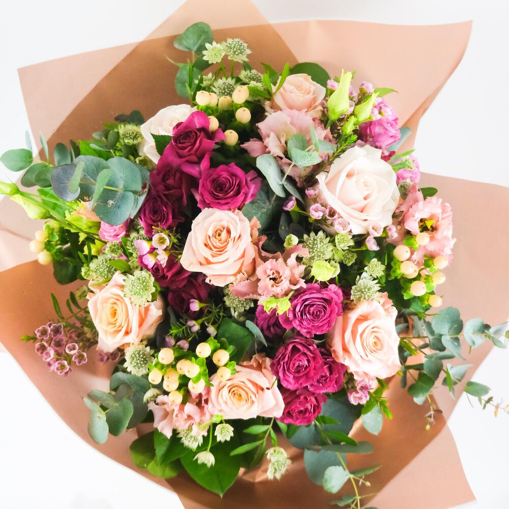 A luxurious and unique bouquet of fresh roses, lisianthus, astrantia and hypericum to charm your loved one.