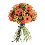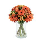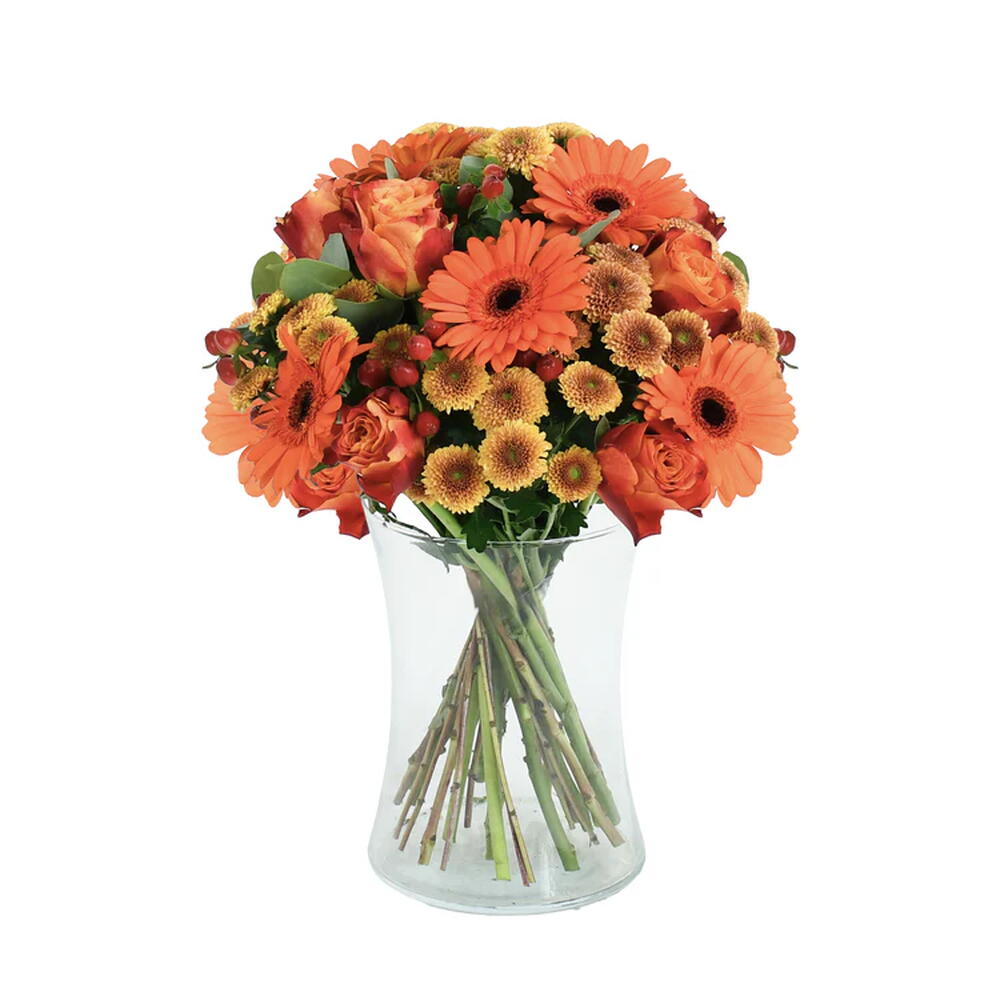 A striking single-colour bouquet awash in warm shades of orange. Velvety roses, bold gerbera, delicate santini and richly toned hypericum berries come together in a glorious harmony of colour, softened by lush seasonal foliage. A bold, beautiful statement for any occasion.