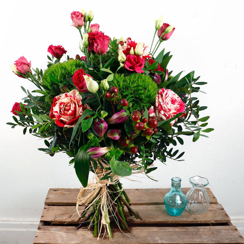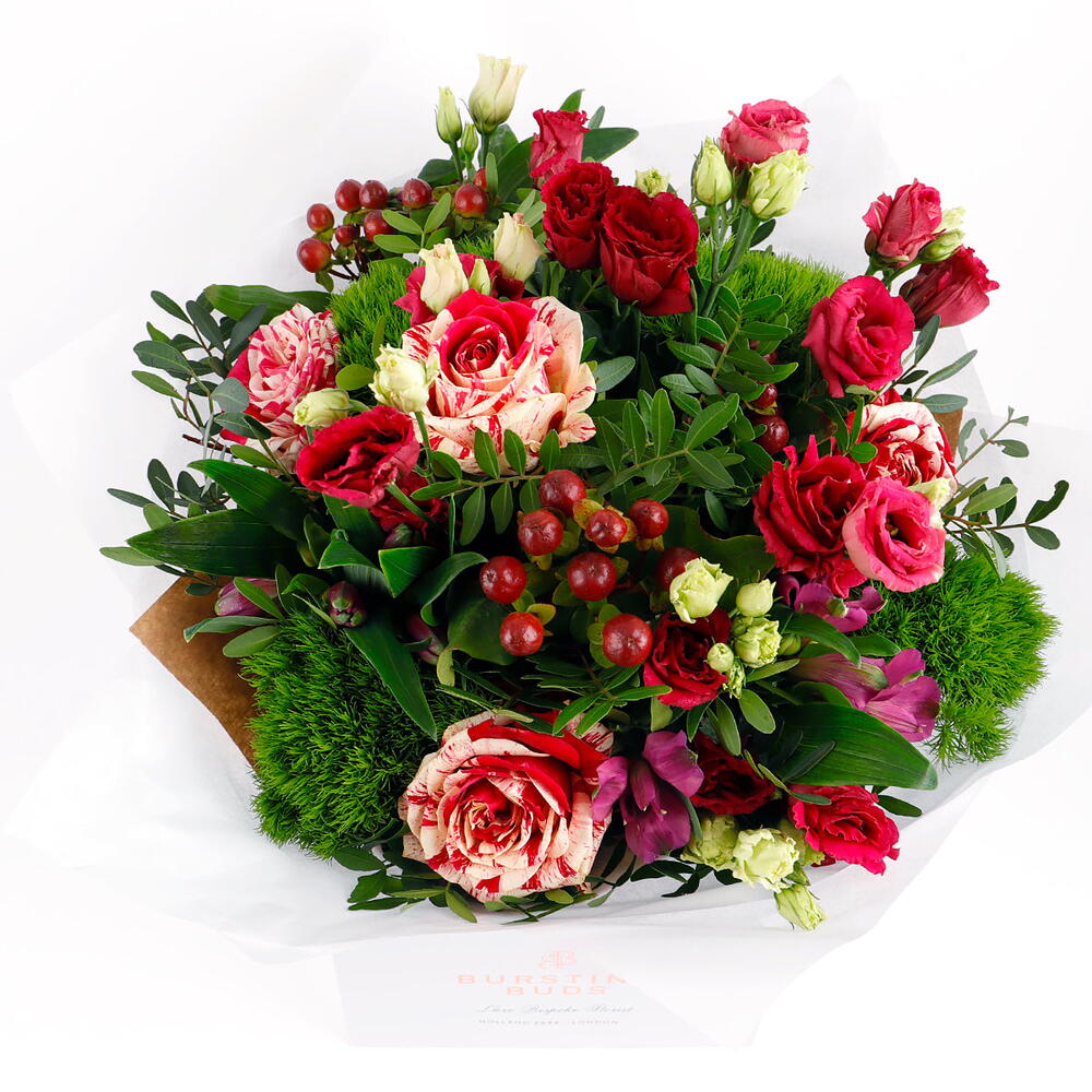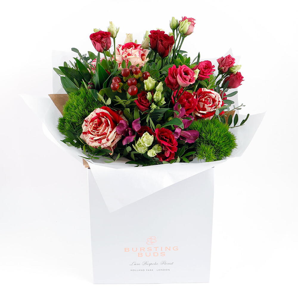 This exquisite bouquet features vibrant red and cream striped roses, soft pink spray roses, and delicate green alstroemeria blooms, complemented by rich greenery and soft berries. The striking combination of colors creates a beautiful balance of warmth and sweetness, making this bouquet a perfect expression of affection and love. With its lush arrangement, it’s ideal for celebrating special moments, such as anniversaries, birthdays, or any occasion that calls for a heartfelt gesture. Carefully wrapped and presented with care, this bouquet is a perfect gift for someone you adore.