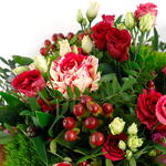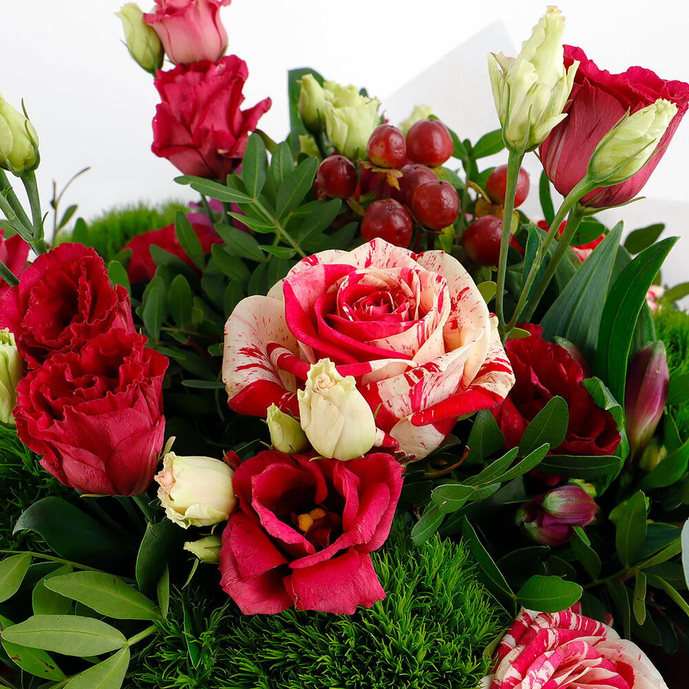 hypericum berries - 2 pcs two-tone red roses - 4 pcs graceful alstroemeria - 3 pcs lisianthus blooms - 3 pcs
