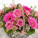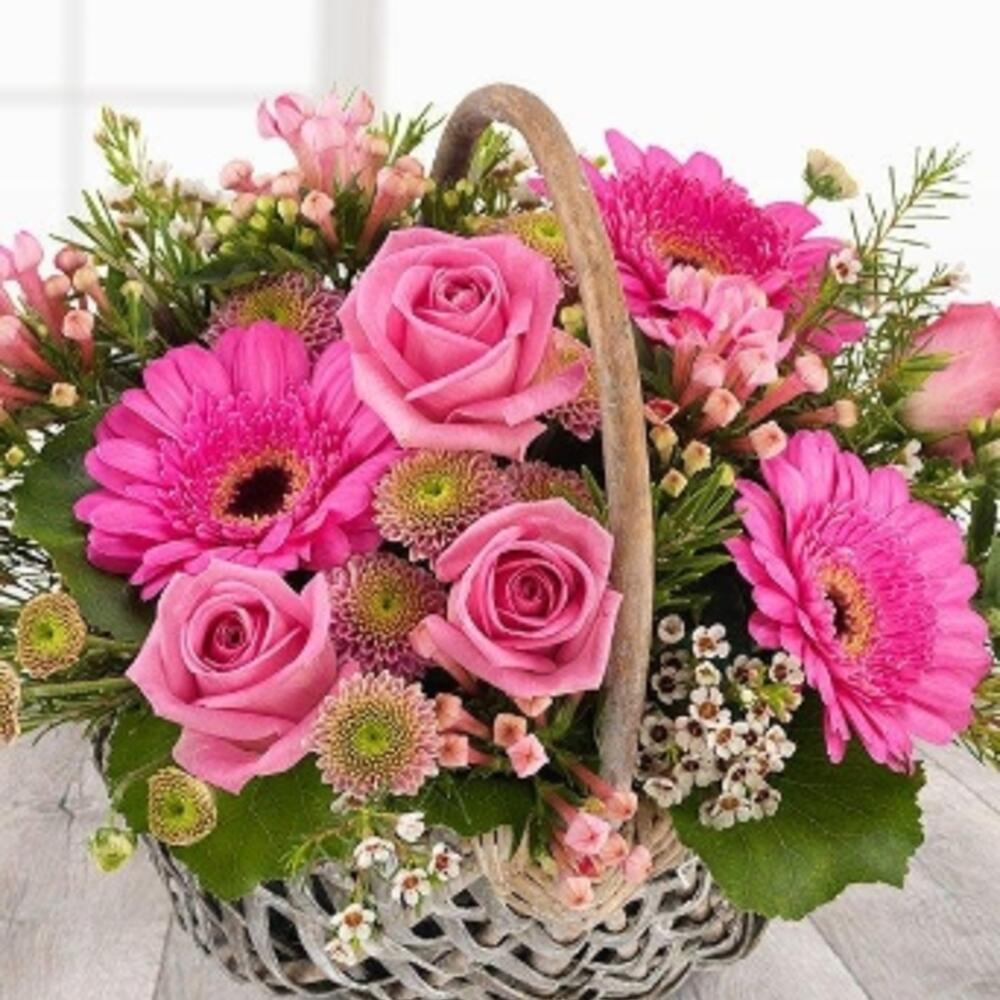 Salal - 5 pcs Pistacia - 3 pcs Pink rose - 3 pcs gerbera mini - 3 pcs spray chrysanthemum - 1 pcs bouvardia and germanised coupled with delicate cream wax flowers. - 2 pcs