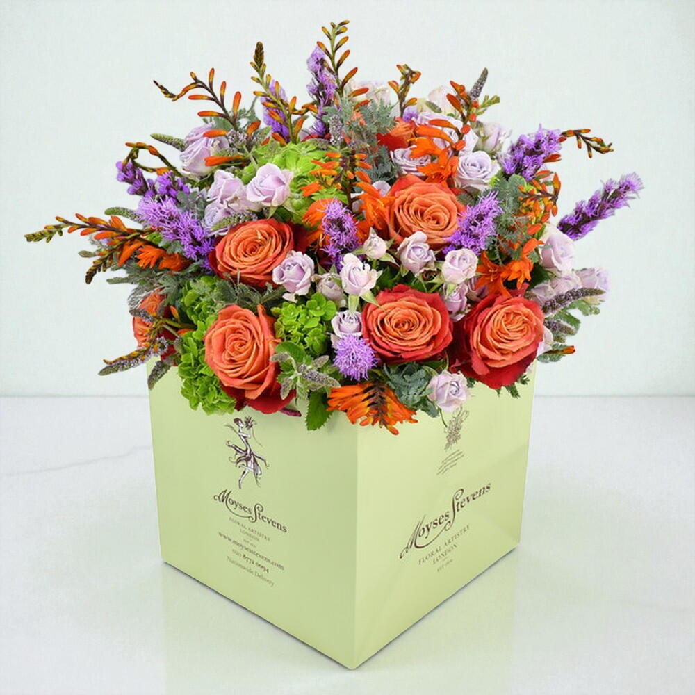 This gathering of burnt oranges and shades of purple combine to make a uniquely colourful bouquet. Bold in colour but achieved with softer tones, this will add a splash of colour and muted brightness to any space. Finished with seasonal greenery and pulled together with vibrant green hydrangeas this arrangement is out favourite of the week.