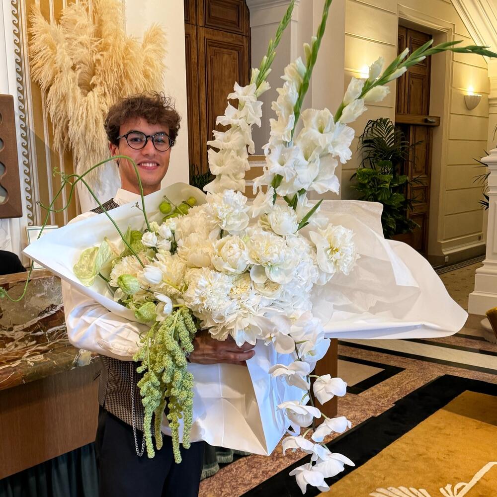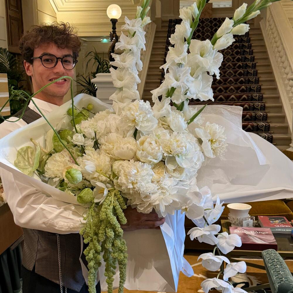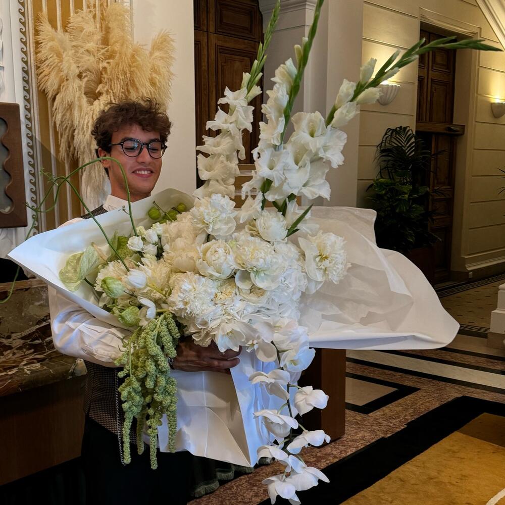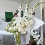 Tulips - 10 pcs Peony - 20 pcs rose - 5 pcs lisianthus white - 5 pcs amaranthus - 6 pcs snapdragon - 3 pcs hedrnageas - 7 pcs gladiolus white - 3 pcs bouli - 4 pcs